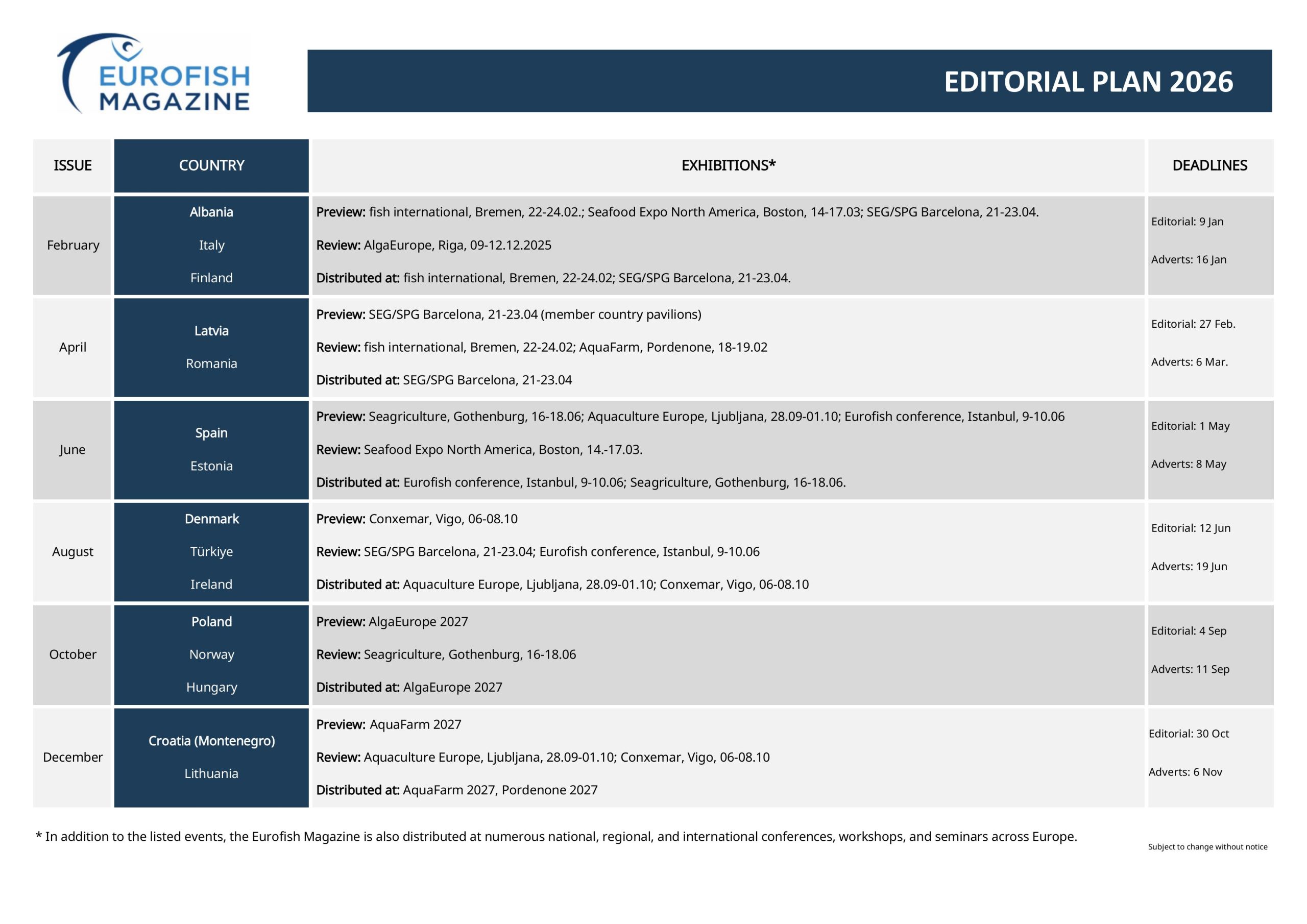 The bulk of the 2,500 copies are distributed throughout Europe, the remainder to Africa, Asia and the Americas. The audience is made up of major retail and wholesale buyers, research organizations, (inter-)national institutions as well as decision-makers in processing, fishing, fish farming, and trading companies. Next to the hard copies and distribution at all major European trade shows and conferences, the Eurofish website presents interactive pages and an online archive that keeps your advertisement visible 24/7.