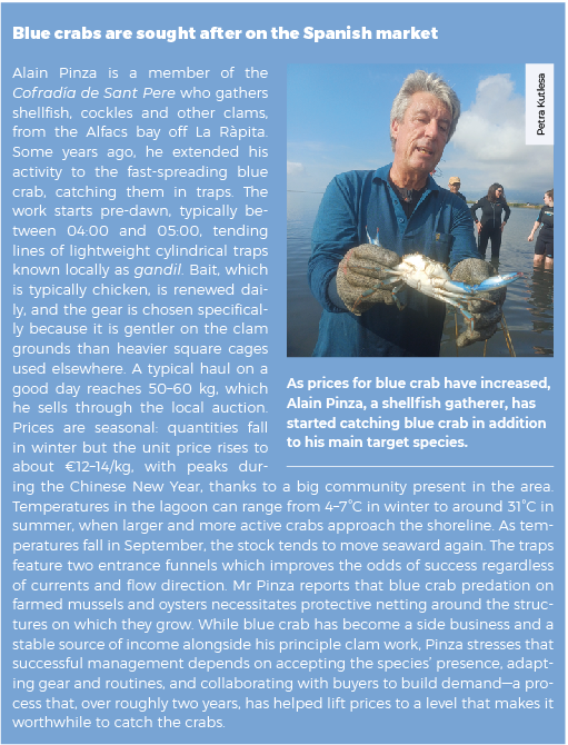 One of the most significant changes in recent years has been the rapid spread in local waters of the blue crab (Callinectes sapidus), an invasive species feared for its disruption of native ecosystems as well as the impacts on fishing gears. First detected in the Ebro delta in 2012, the blue crab’s explosive population growth was a cause for concern, as it outcompeted local species and also preyed on them. According to Mr Navarro, local fishermen were alarmed as the crab aggressively spread, killing off other marine life, destroying their nets and consuming quantities of valuable shellfish. To combat this, the cofradía, in collaboration with local authorities, began regulating the crab’s fishing, making it a targeted catch rather than a bycatch. This move was essential to reduce its population and ensure that the crab didn’t continue to harm the biodiversity of the area. Managing the predator called for a series of steps that culminated in a management plan approved in 2018 that had the support of all the stakeholders. Among the initial steps was a monitoring programme which sought to evaluate the blue crab situation in the Ebro delta and control the population. Researchers from ICATMAR calculate that between 2016 and 2023 catches amounted to 1,865 tonnes which generated an income of EUR4.5m. The average first sale price was EUR3.9/kg. Most of the catches, close to 70%, were in the two bays Fangar and Alfacs with 20% caught in the river Ebro. Sampling stations were established in the bays, river, sea, and lagoons and crabs were caught in traps to capture biological (sex, size, weight, etc.) data. The researchers found that the blue crab was an important resource for the fishers and they emphasise the importance of promoting the blue crab market and maintaining the first sale price to minimise the blue crab population and to preserve the environment. Mr Navarro notes that fishing methods for blue crab have evolved significantly. At the beginning of the invasion, the approach was volume-driven to land as many crabs as possible to alleviate ecological pressure, while initial prices stood at around 1 EUR/kg, and occasionally lower. Today, the average fisherman can capture 50 to 60 kilos of blue crab per day, with a market price of around 4 euros per kilo.