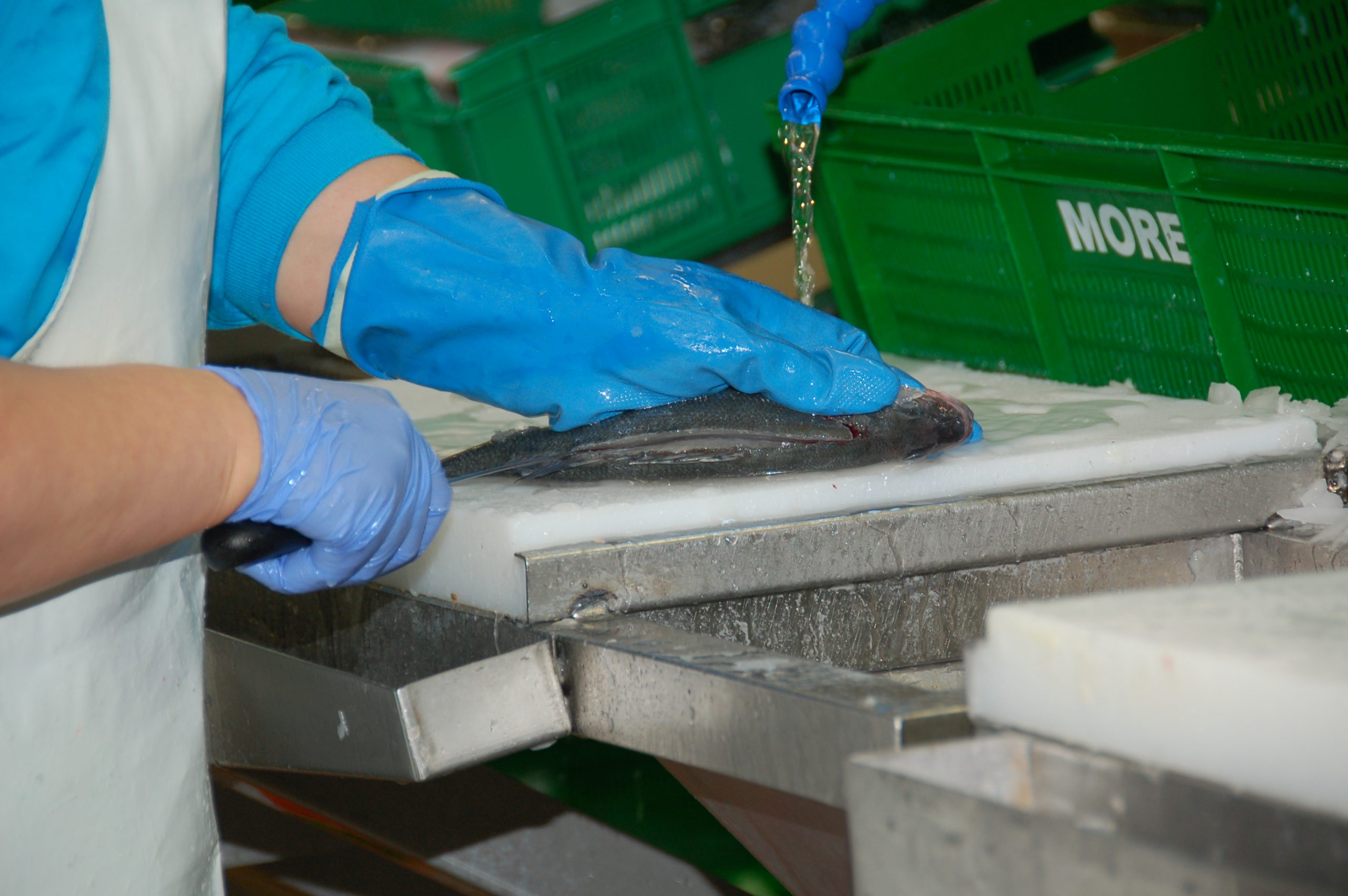 The raw material arrives at the factory from the cages in tanks filled with a mixture of ice and water that maintains the fish at a temperature between 0 and 2 degrees. Samples are taken from each tank to monitor the internal temperature and to check for parasites. The tanks are emptied in to a large receptacle which carries the fish on a belt to the automatic grading machine. The grader divides the fish in to the desired size categories, for example, 200-300 g, 300-400 g, 400-600 g etc. placing all the fish in a size category into a crate. At this stage the fish are checked for marks or deformities and removed from the processing operations if necessary. The plant has the capacity to produce 20 tonnes of whole fish a day. Once the fish has been graded it goes through a descaling machine to remove the scales before going further through the production process. Although production is maintained all the year round, there is a peak in the months leading up to Christmas. During this period the company hires more staff, to cope with the increased volumes. This period is also a time when demand for other products such as meagre increases. Asli Kahramanoglu, the export responsible, says although More does not produce meagre it obtains the fish in order to supply customers who request it. It is popular in the United Arab Emirates and in some countries in Europe, and she foresees a bright future for the fish.