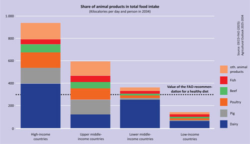 On a regular basis, the Organisation for Economic Co-operation and Development (OECD) and the Food and Agriculture Organization (FAO) assess markets for agricultural commodities and fish, and forecast likely developments to provide policymakers with a sound basis for decisions. On 15 July 2025, the OECD and FAO published the 21st edition of this analysis, Agricultural Outlook 2025–2034, according to which consumption of animal-based foods is likely to rise particularly in middle-income countries. There, analysts expect growth of a hefty 24 percent—four times the global average. Despite this increase, the share of animal-based foods in daily caloric intake remains low in middle-income countries, averaging 364 kcal per person, only just above the FAO’s recommended 300 kcal per day. In low-income countries, 143 kcal does not even reach half the benchmark for a healthy diet.
