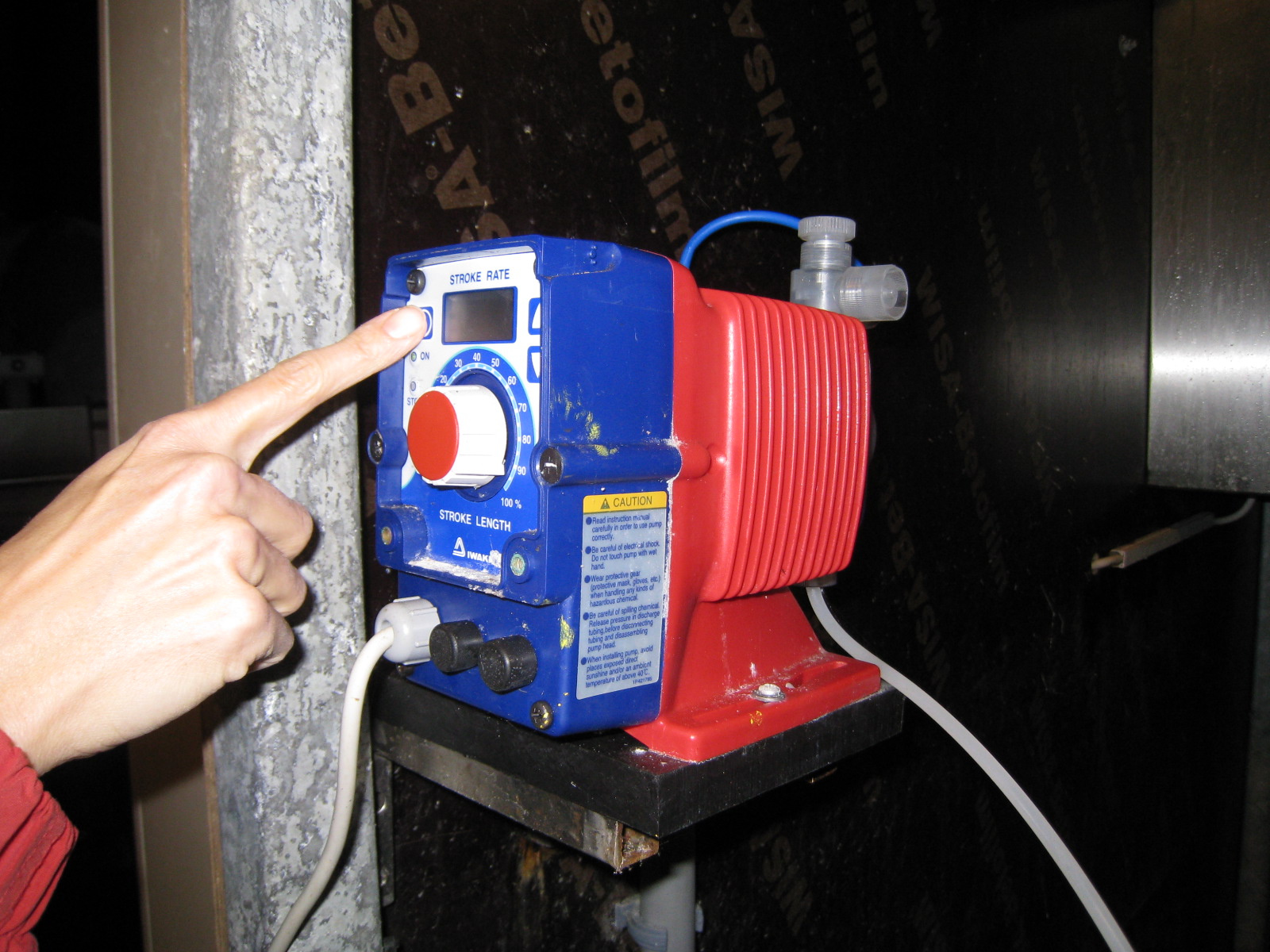 water. In some systems a lime mixing station is installed dripping limewater into the system and thereby stabilizing pH. An automatic dosage system regulated by a pH-meter with a feedback impulse to a dosage pump is another option. With this system it is preferable to use sodium hydroxide (NaOH) as it is easy to handle making the system easier to maintain. Anyone handling acids or bases must be careful as it can severely burn eyes and skin. Safety precautions must be taken, and glasses and gloves must be worn while handling the chemicals.
