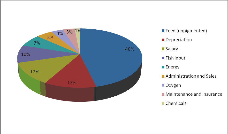 From Figure 4.5 it is interesting to note that the consumption of energy is only 7% of the costs. Focusing on the usage of electricity is of course important, however, it is by no means the dominant cost. In fact this is equivalent to many traditional farms where the use of paddle wheels, return pumps, oxygen cones and other installations use quite a substantial amount of energy. The cost of feed is by far the most dominant cost, which also means that good management is the most important factor. Improving the FCR will have a significant impact on the efficiency of the production.