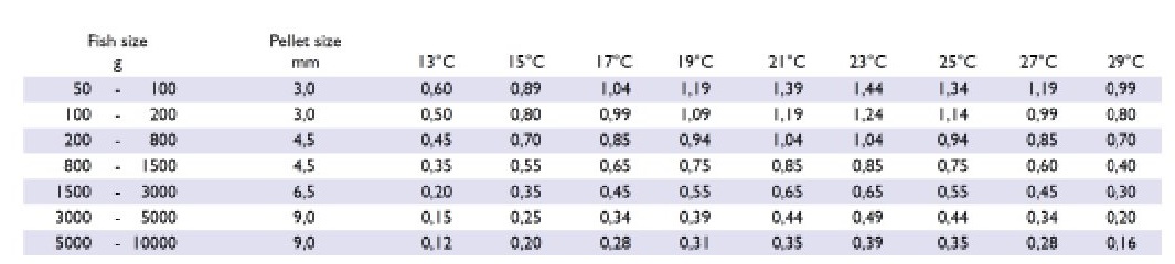 The feed intake, and the feed conversion rate (FCR) of the feed, is of course an integrated part of these calculations. An easy way of approaching the production plan is to obtain a feeding table for the fish in question. Such tables are available at the feed manufacturers, and the tables take into consideration the fish species, the size of fish, the water temperature (see Figure 4.3). Dividing the feeding rate by the FCR will give you the growth rate of the fish. The weight gain from one day to the other can hereafter be calculated using the computation of interest expressed by: