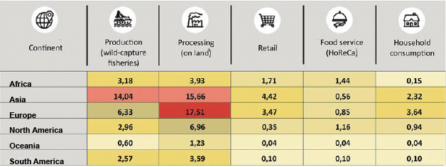 Percentage loss of edible aquatic food worldwide by continent and at key nodes in the value chain.