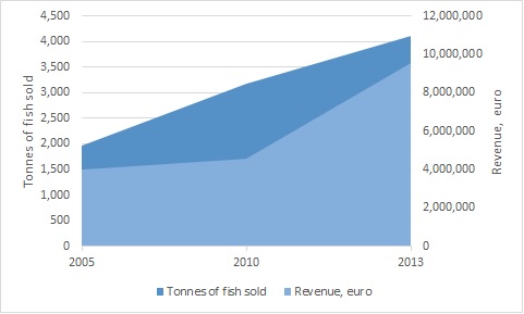 Closed system aquaculture supplied about 99 tonnes of fish, although this is an 11-fold increase since 2010. In 2013, the value of marketed aquaculture production from CAS totalled around EUR 0.36 million. CAS have a total capacity of 2,102 cubic metres. So far, CAS have been a novelty in the Lithuanian aquaculture sector. Only in recent years has the implementation become more widespread. Compared with pond aquaculture, it is much simpler to start CAS aquaculture production because it requires less water and a smaller land area.