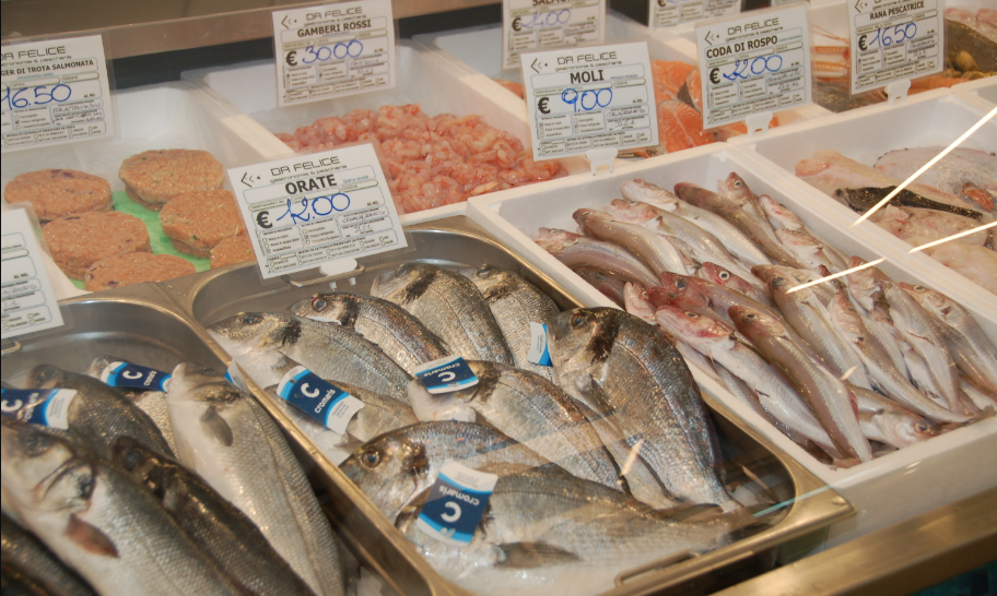 Within 24 hours of being harvested the fish is displayed at sales counters in Italy.