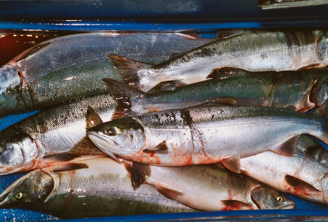 Pacific wild salmon are not only caught using purse seines but also with fixed nets and trolling lines.