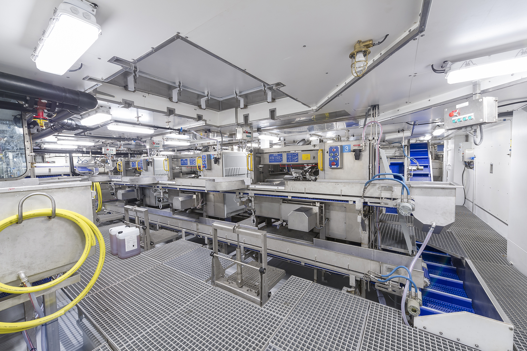 Another technology manufacturer in the Legasea group is OptimarStette which offers customized machine solutions for fish processing on board and on shore. The spectrum ranges from machines for the stunning and humane killing of fish, freezing or palletising pre-packed products to fully automated production lines, partially with the integration of robot technology. Although as a specialist in complete factory design Optimar has a lot of experience in fish processing, fitting the production lines into the confined spaces on board a fishing vessel is always a challenge, especially since the operation on a rolling ship requires specialized knowledge. However, the Optimar developers have great experience in this field and have already equipped several fishing vessels with equipment for the processing of demersal fish, pelagic fish, squid and shrimp. Unlike in the past, when after the catch the cod lay iced in boxes up to the time of processing the fishes are now often kept alive for several hours on modern trawlers, which has a particularly advantageous effect on the quality of the fillets. Sales Manager Geir Espen Otlo stated that about 95% of the captured white fish are still alive when they are taken on board. Dead fishes are of course processed immediately, the others are put into tanks where they can reduce stress. The Optimar tanks can hold about 40 t of fish on board for intermediary storage. This is usually sufficient for processing the fishes one by one before the net is hauled in again with the next catch.