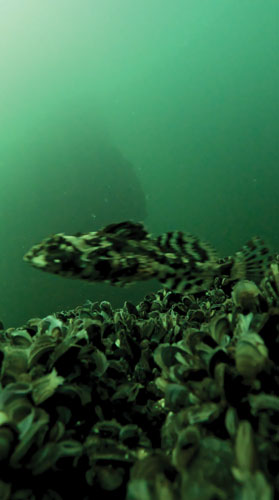 Scour protection around a wind turbine at the Win@Sea project. Small mussels and a fish can be seen.