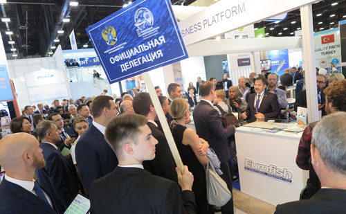 As one of the services to its member countries, EUROFISH International Organisation occasionally facilitates the participation of delegations at trade fairs around Europe. Third edition of the EUROFISH Business Platform at Seafood Expo Russia was held in St. Petersburg, Russia 10-12 July 2019. It was a good occasion to bring a delegation of the officials from the Ministry of Agriculture and Forestry, representatives from the Central Union of Aquaculture Producers, as well as fish farmers and traders from Türkiye to Russia . It gave the participants an opportunity both to explore the Russian seafood market and to introduce their products and services. Companies at EUROFISH Business Platform offered a wide spectrum of fish products attracting a lot of visitors.