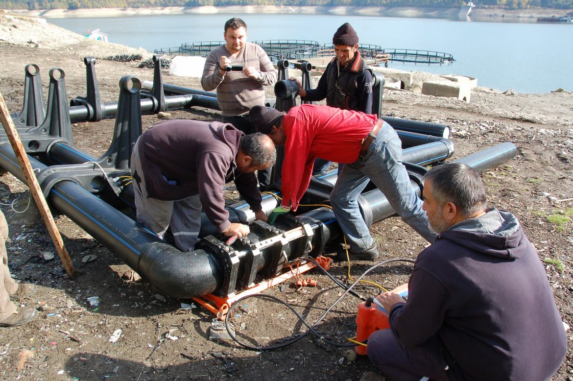 While commercial production will commence in 2016, in reality it will be a period of experimentation and observation. We are going to try different feeds and different strains of trout from Poland, Turkey, Hungary, Romania, and possibly even Denmark, says Mr Lazarescu, and closely monitor the results so that we can see what works best in this environment. Although trout is widely grown in Romania, the fish are typically kept in raceways, ponds, or recirculation systems. Cage farming is a novelty; Mr Lazarescu thinks his farm will be the first in the country to culture trout in cages. He was inspired, he says, by Turkey, where this kind of production is well established, but is also aware of similar systems in Norway and Denmark. But in Scandinavia the equipment is much too expensive, he observes. We need the technology from there – but at Turkish prices. For the cages the company has therefore sourced the materials locally, but has a consultant from Turkey with a team that is supervising the actual assembly.