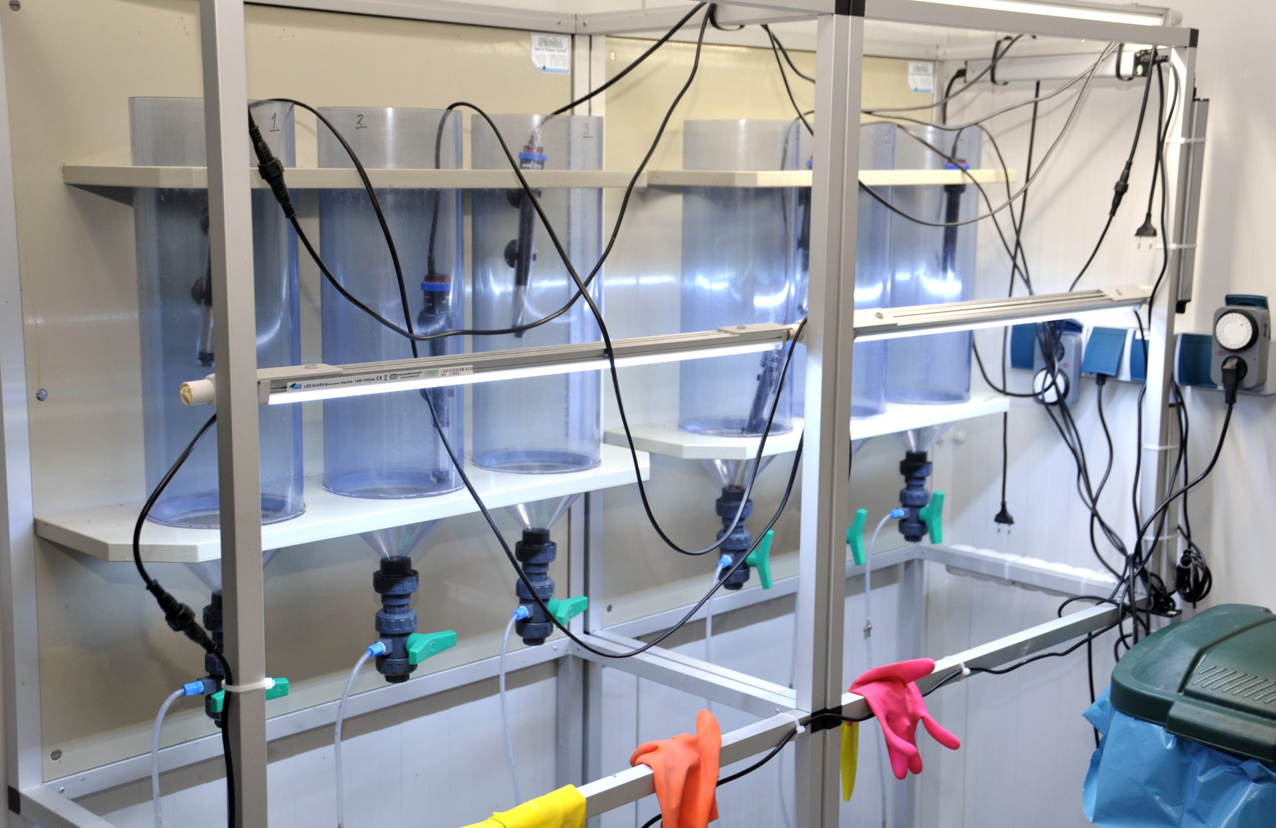 The four rooms within the house now contain five recirculating modules with a good two dozen tanks of various sizes which were specially produced in Turkey. Added to these are several 700 litre aquariums in which the eggs are hatched and the larvae are kept and fed after hatching. Water treatment comprises not only a drum filter but also an organic filter which is divided into fixed bed and moving bed zones. Above the moving bed is a CO2 extractor that is fitted with a heat exchanger for recovery of energy. At the end of the process the cleaned water is sterilised with UV light and enriched with oxygen from an oxygen generator in an adjacent technology room. All the systems are arranged in a logical order and are easily accessible. There are broad aisles and open areas in all the rooms to offer the employees good working conditions.